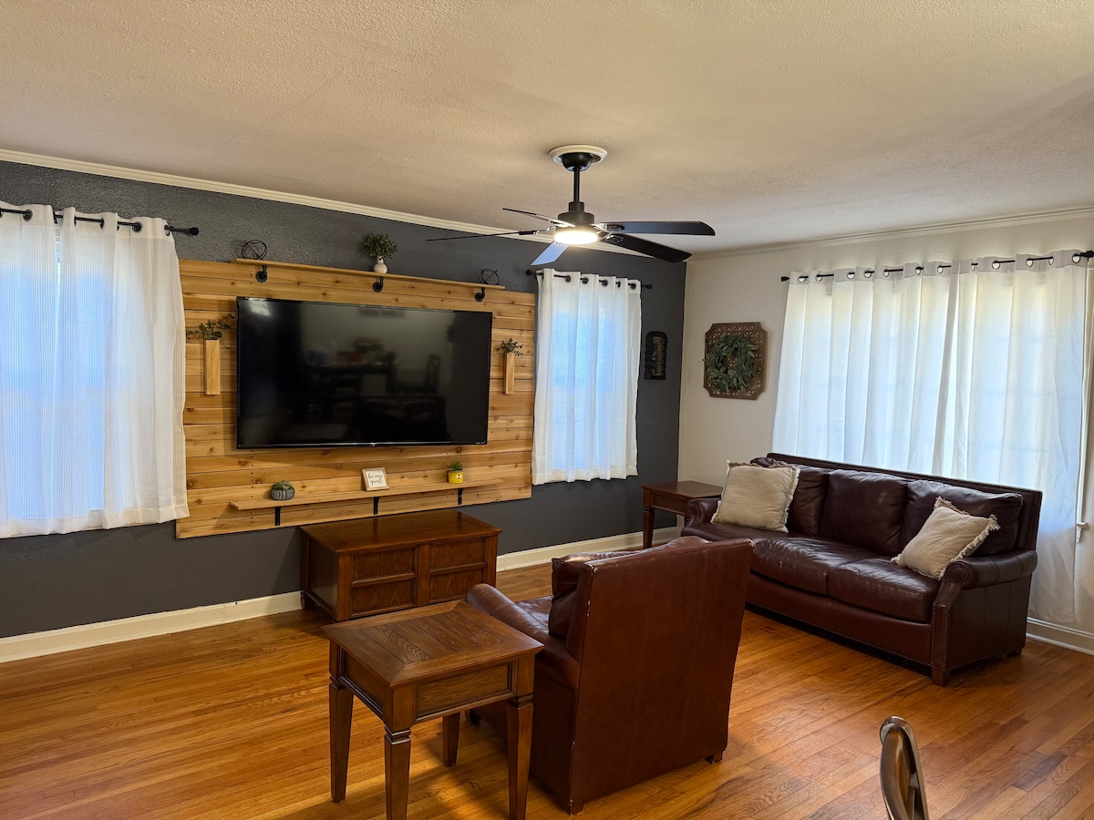 Welcome to a peaceful, centrally located home in a quiet neighborhood. It's a short walk to local food trucks and a 3-minute drive to shopping, restaurants, and Historic Downtown Sallisaw. This home is perfect for stays from 2 nights to a month, featuring 2 bedrooms with queen beds, a comfy couch, and a queen air mattress for extra guests. Enjoy a fully equipped kitchen, cozy living spaces, and the added security of a storm shelter on the property. Book now for a relaxing and convenient stay!