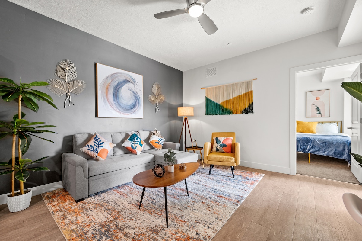 Experience luxury in our spacious apartment located in the heart of SLC. Enjoy stunning mountain views from the open floor plan and modern bohemian decor of the spacious living area with a large flat-screen TV. The fully equipped kitchen and en-suite bathroom with a luxurious shower make your stay comfortable. The central location puts you just steps away from restaurants, bars, entertainment venues, university, hospitals and convention centers. Book now and enjoy the best of Salt Lake City.