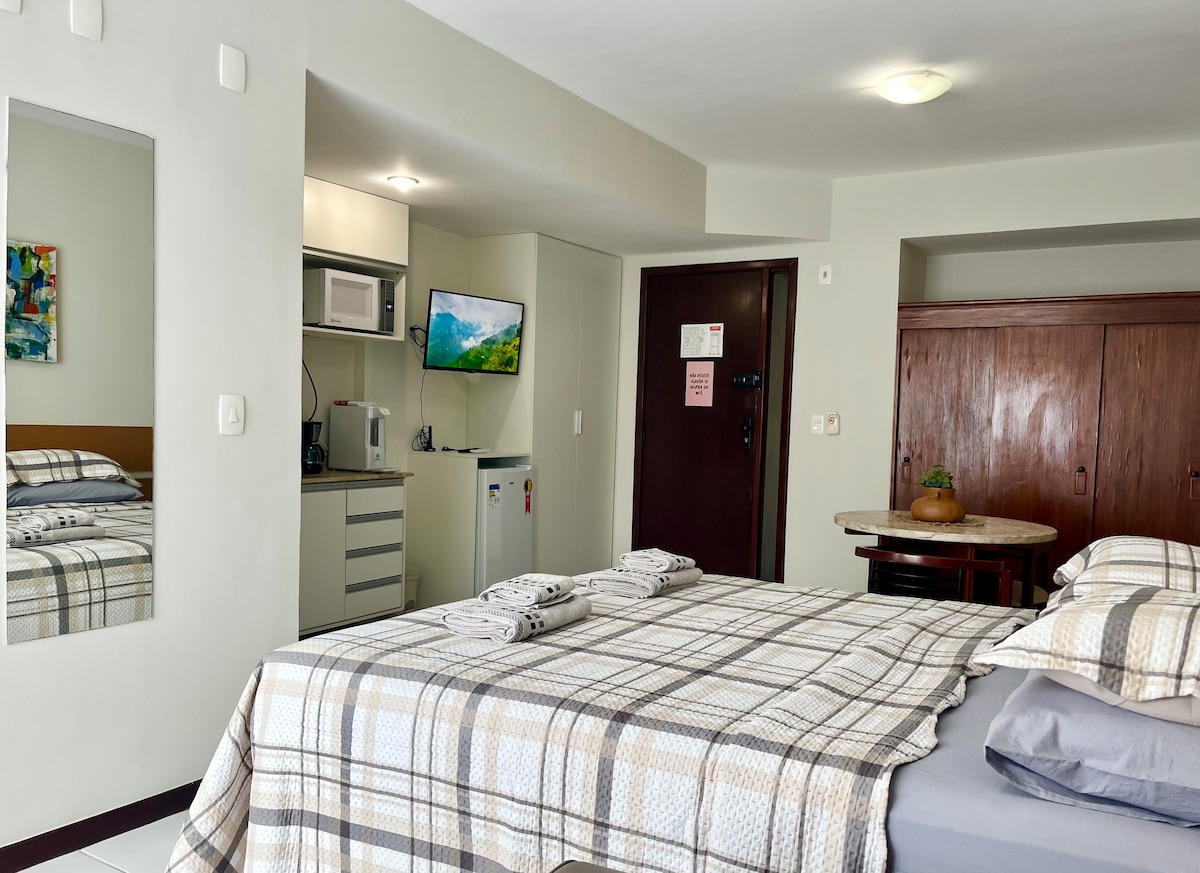 Brand new suite, with beautiful and modern decor, in a 4-star hotel with a very privileged location, in front of Salvador Shopping. It is located on Caminho das Árvores, one of Salvador's noblest neighborhoods, 100 meters from the metro station. It has a smart TV, air-conditioning, minibar, wardrobe, safe, table and chair for meals and/or office, in addition to the bathroom that guarantees a super relaxing bath. It also has free parking, a swimming pool, a fitness center, a restaurant and a game room.