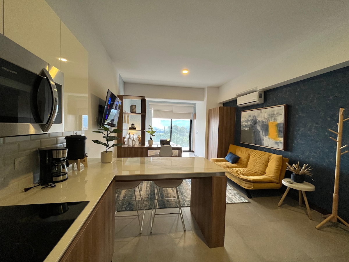 Enjoy a spectacular view of the volcanoes from your private balcony in this cozy, modern studio. It’s fully equipped with high-quality amenities, from a comfy queen-size bed to a handy sofa bed for extra guests. With a fully equipped kitchen, and black out curtains, you’ll have everything you need for a relaxed and fun stay. It includes one parking space, on-site gym and access to the building’s convenience store. Just 8 minutes from the airport is the perfect place for you and your beloved