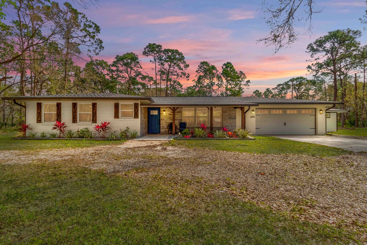 Escape to New Smyrna Beach! 3BR/2BA pet-friendly home designed for families, groups, and couples—minutes from Canal St., Flagler Ave., Bending Branch Ranch, and the beach. Guests love our thoughtful decor and luxury mattresses. ✔ Cowboy pool + fire pit w/ string lights ✔ Fenced backyard – perfect for pets ✔ Luxury mattresses, blackout curtains & linens ✔ Fully stocked kitchen w/ café appliances + espresso machine ✔ Dedicated workspace + smart TVs ✔ Parking for trucks, trailers, or boats