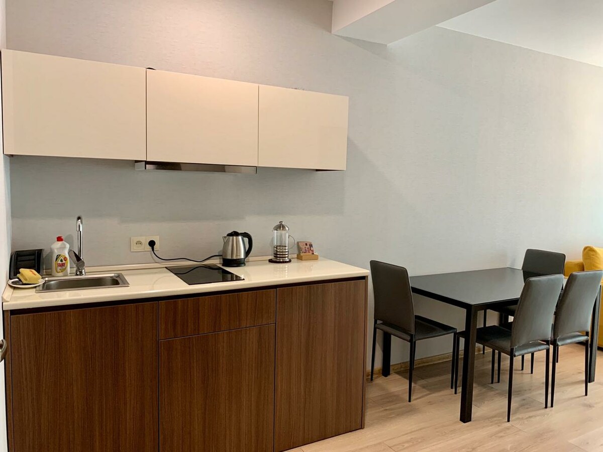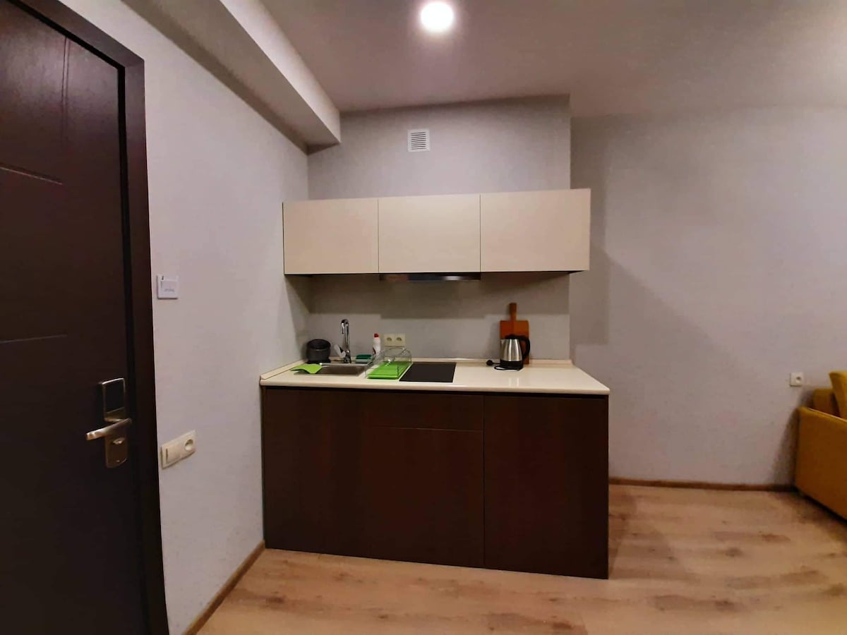 ●Park Residence complex 35 sq.m studio. Our Studio Triple Apartments offer Beds with comfortable 1 Queen+1 Sofa. ●The studio triple apartment also offers an ensuite bathroom with shower and toilet. ●Fully equipped kitchens make dining easy with full tea and coffee making facilities, fridge and freezer, microwave and washing machine. All cooking utensils and cutlery are supplied. ●Close to the apartments are supermarkets, pharmacies. ●The best holiday apartment in the center of Bakuriani.
