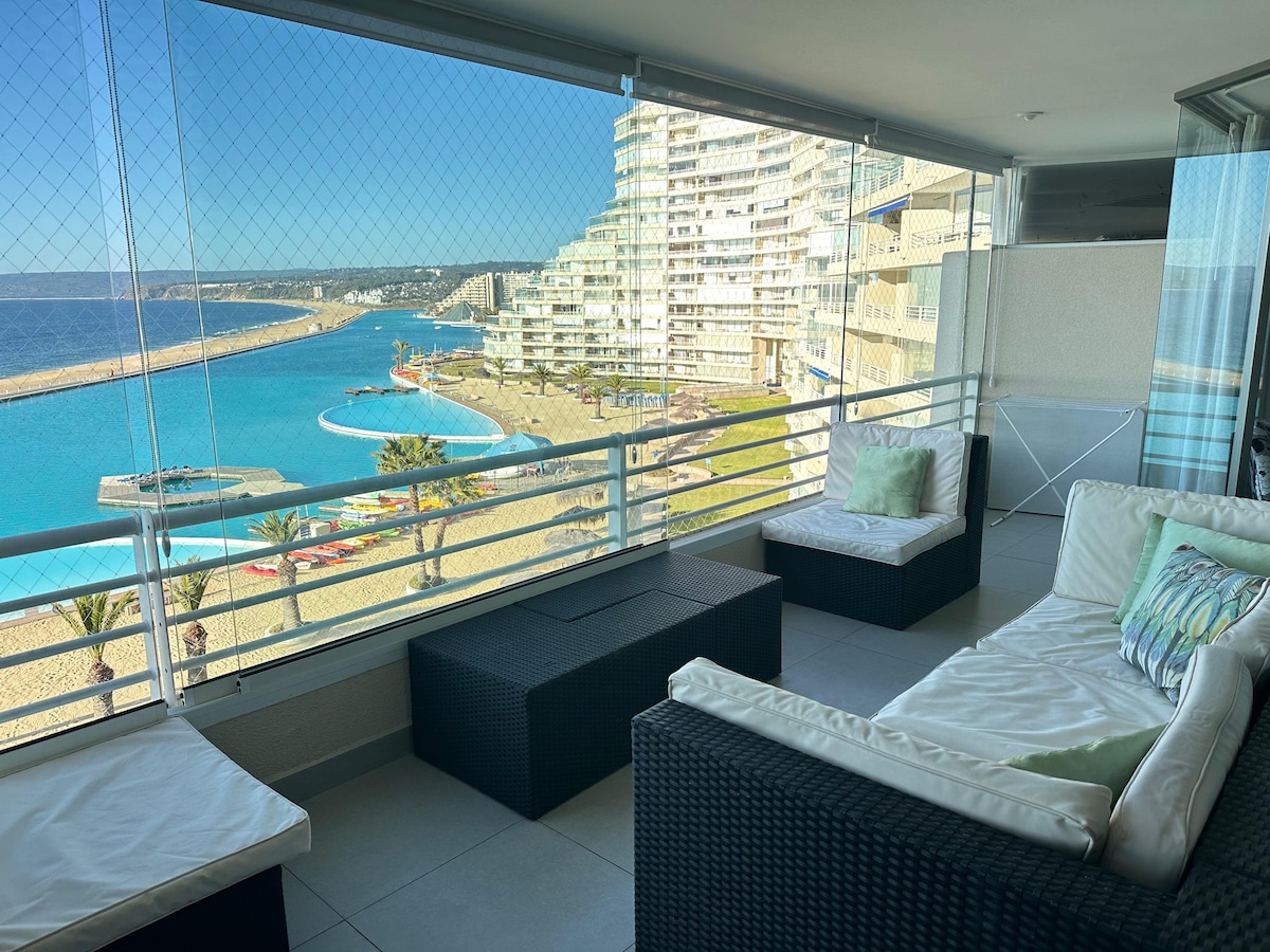 Espectacular departamento en San Alfonso del Mar, Algarrobo. Dos dormitorios, dos baños, living, cocina americana, televisor, gran terraza con vista panorámica de la bahía. Condominio muy seguro, cuenta Laguna artificial navegable, piscinas menores, piscinas temperadas, jacuzzis, sauna, acceso a playa y mar. Restaurantes, canchas fútbol, volley, tenis y juegos para niños. Nota: Desde pandemia, el acceso a piscina temperada, jacuzzi y sauna se encuentra con acceso restringido.