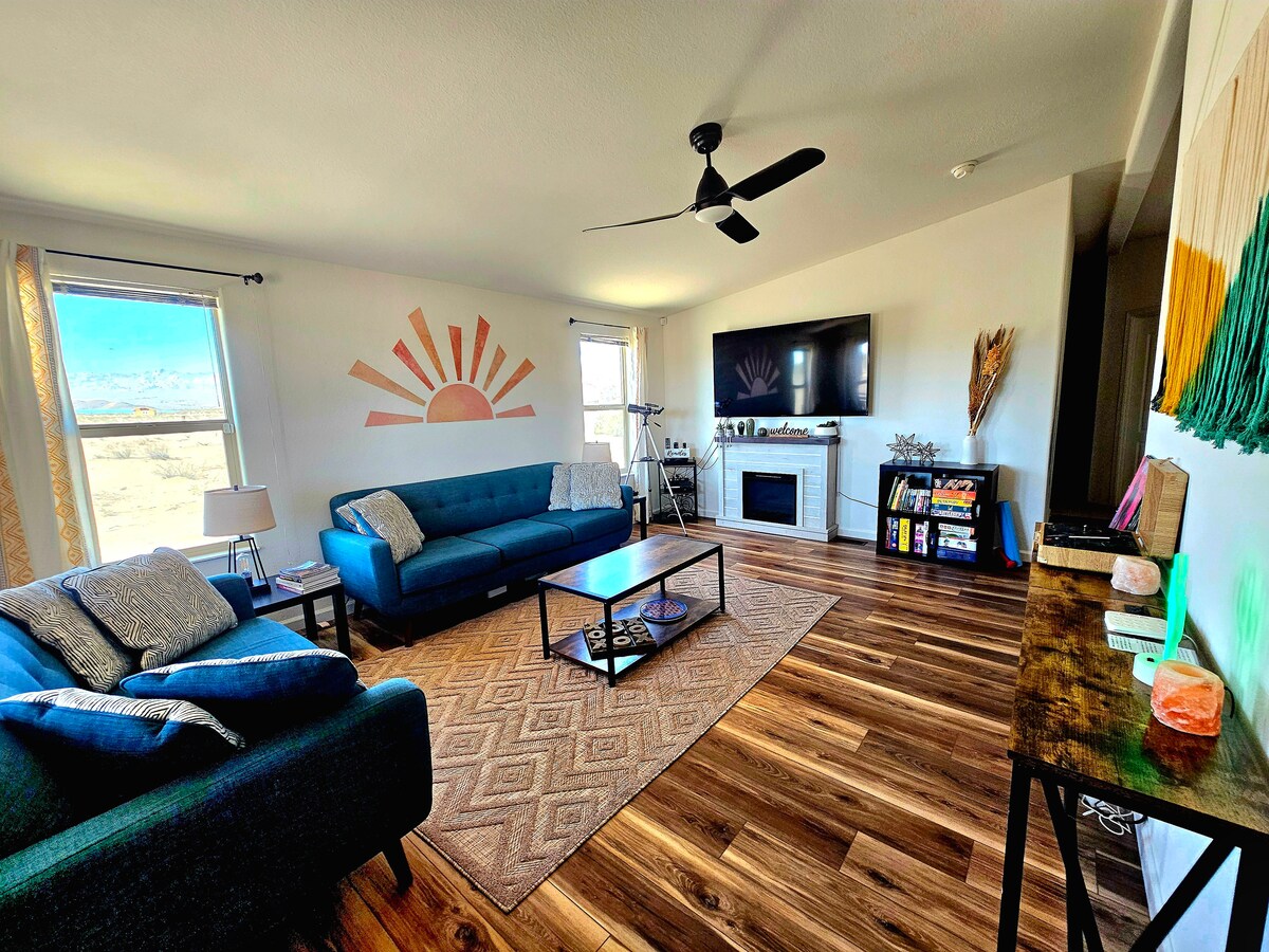 Welcome to Cosmic Cowboy in Pioneertown, CA – where history, rustic charm, and modern comfort collide in the heart of the Old West. Walking distance from the heart of Pioneertown, you'll be able to walk and enjoy dinner and a concert at the famous Pappy & Harriets and a drink at Red Dog Saloon. Immerse yourself in the fascinating past of Pioneertown and soak in the breathtaking views of the surrounding mountains and valley while enjoying all the modern amenities of this ranch-style home.