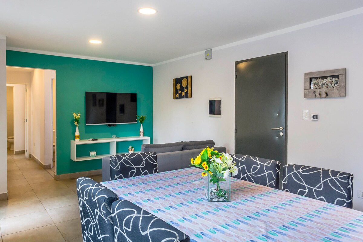 Comfortable downtown apartment, ideal for families, 5 blocks away from Plaza 9 de Julio, with garage (only for small cars, not vans) The apartment has an equipped kitchen, living-dining room, TV with Netflix and Starplus. Wi-Fi and air-conditioned rooms. One bedroom with a double bed and another bedroom with two twin beds. The apartment has a garage
