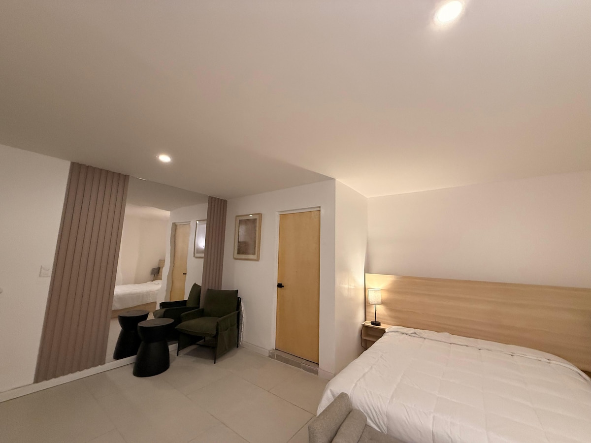 La ubicación está cerca del aeropuerto, las plazas y lo más buscado por los viajeros la embajada de EE.UU. consulado. Vista es una habitación elegante, amplio, moderno y limpio. Tiene una cama king size, colchón muy cómodo, Wifi rápido, televisor inteligente de 45” con Netflix, etc. Cama moderna, dos mesas de noche, comedor de cristal con dos asientos, Nevera pequeña para comida y botanas, Aire condicionado, Agua C + F y una ducha estilo rainfall.