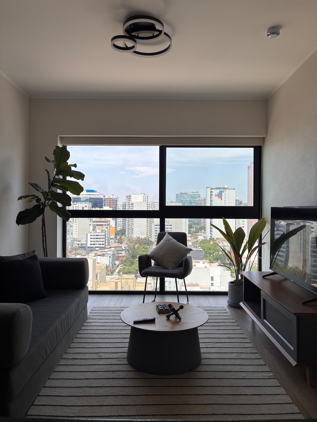 **Brand new apartment. Most central area of the city, steps from San Isidro** 100% equipped, beautiful common areas such as gym, terrace, rooftop grills, spectacular view. Centrally located and perfect for getting around Miraflores, Barranco, Lima Centro. Close to malls, entertainment venues, and restaurants. 8th floor of a modern 25-story building, with wifi. Fully equipped kitchen, bathroom and a bedroom with a queen size bed. Entry with key and smart lock