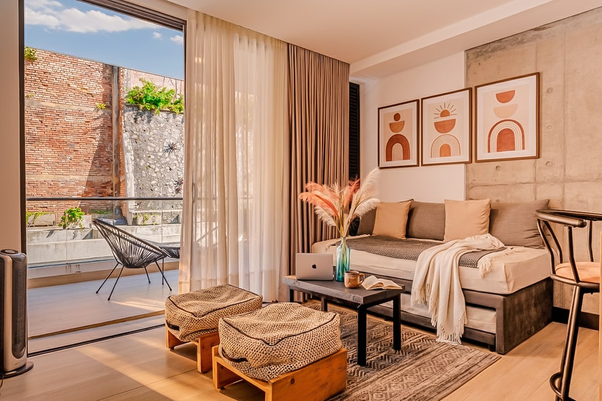 Enjoy in the heart of San Antonio in a luxurious apartment with a terrace and urban view. Perfect for relaxing, working from home, or enjoying a sunset coffee with complete privacy. Central location, close to the most attractive of Cali, behind the Intercontinental Hotel. The space has a room overlooking the private patio, fully equipped kitchen, living room with sofa bed and a terrace perfect to enjoy the sunset with total privacy