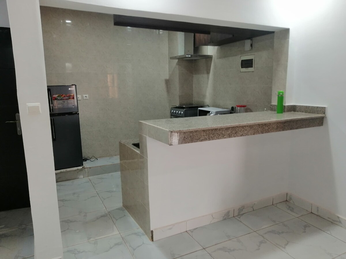 Welcome to our splendid new house (180m²) located at Lac carrefour cité paisible. It is close to the downtown and restaurants (maquis). Service: - Four spacious rooms (+ one dressing) - Fous bathrooms - Immense living room - Fully equipped kitchen - Courtyard - Parking Household items: - Air conditioning in every room - Wi-Fi - TV Canal+ - Washing machine - 1m³ water tank - Electric generator - Hot water On demand someone can come to clean and cook