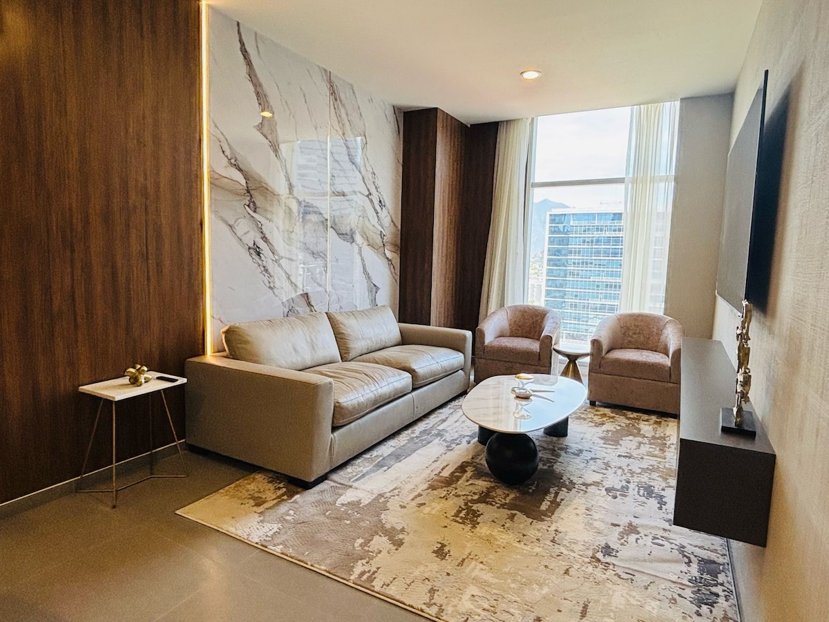 ✨ Experience Monterrey from Above 🌆 Relax in our modern 2BR/2BA apartment in San Pedro with stunning panoramic views. Two queen beds, 2 full bathrooms, fully equipped kitchen, A/C, fast WiFi, washer-dryer, parking & 24/7 security. Perfect for business, medical or leisure trips: minutes from top hospitals, Showcenter, shopping centers and the best restaurants. Ideal for short or long stays, blending the comfort of home with the boutique experience only San Pedro can offer.