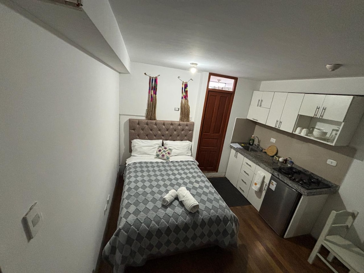Modern and comfortable studio located in a central area of Cusco, where you can find supermarkets, restaurants, pharmacies, banks and financial institutions, exchange houses, health clinics and others very close by. Simple, functional, cozy and well-lit modern decor. A room with Wi-Fi, Netflix, Magic Cable, comfortable sofa, fully stocked kitchenette, shower with plenty of hot water 24 hours a day, terrace with umbrella and panoramic view of the city.