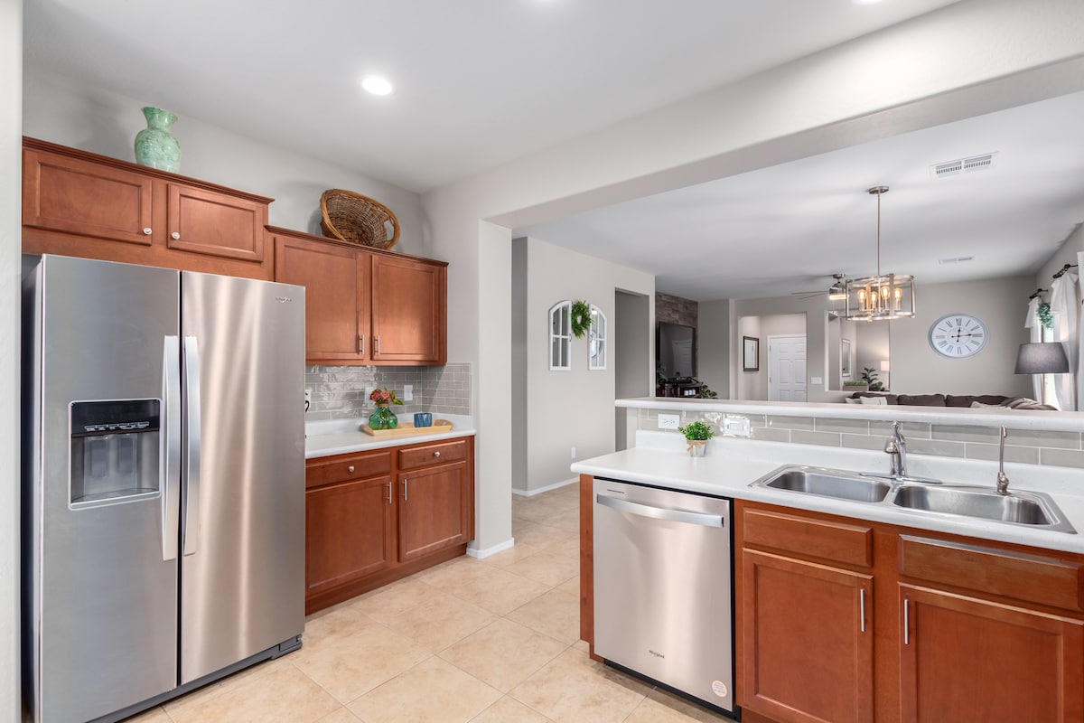 Make yourself at home in this spacious 3-bedroom, 2-bath home in the San Tan Valley. The open concept space is full of light with a large kitchen and living room, perfect for groups of up to 6. Keypad entry provides easy check-in. Southeast of the greater Phoenix/Mesa metropolitan area, there is quick access to hiking, golf, biking... but still close enough for your dining and shopping pleasure. Take in the open spaces of the Arizona landscape while still being close to urban attractions