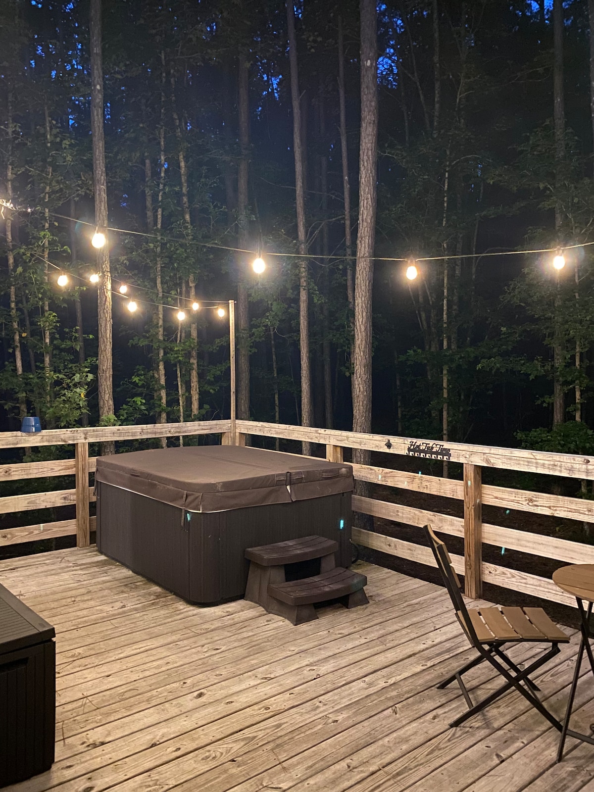 Welcome to the beautiful Highland Cottages at Lake Guntersville! Each cottage has a built-in King bed with memory foam mattress, a kitchenette with a coffee maker, tea kettle, dishes, glasses, and cutlery, and even a small refrigerator. Pamper yourself at the beautiful vanity with all the items needed to make you look and feel your best. Included are a hair dryer, makeup mirror, complimentary soaps and lotions, and the softest towels we could find. The deck and hot tub complete the experience!