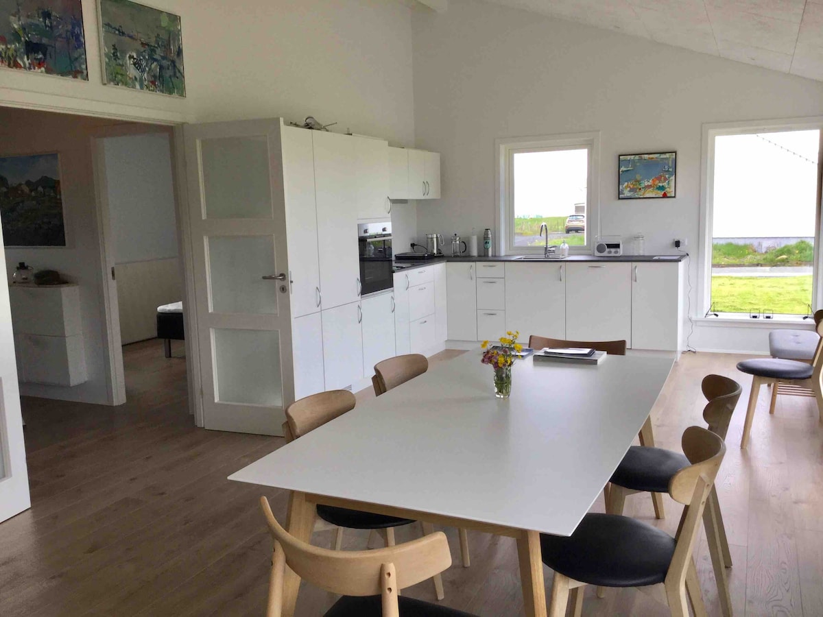 Luxury cottage in a first class scenic location - with close attention to details. Magnificent views towards the lake "Gróthúsvatn", the ocean, mountains and fields with sheep and vivid birdlife. Accessible to wheelchairs. Accommodation for 8 persons, 2 double bedrooms on the ground floor. In the loft, there are 2 single beds, partly shielded and a sofabed which sleeps 2. Wellness package includes outdoor jacuzzi, tub with cold water, sauna, bathrobes & Weber gasgrill. Electricity is included.