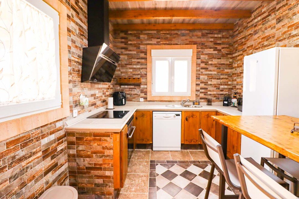 Rustic decoration, wooden windows, walls with stone decoration, wooden ceilings, main house with 2 bedrooms, living room, kitchen and bathroom. Guest house with bedroom and bathroom. On a plot of 800m, two double beds, two single beds and four double sofa beds