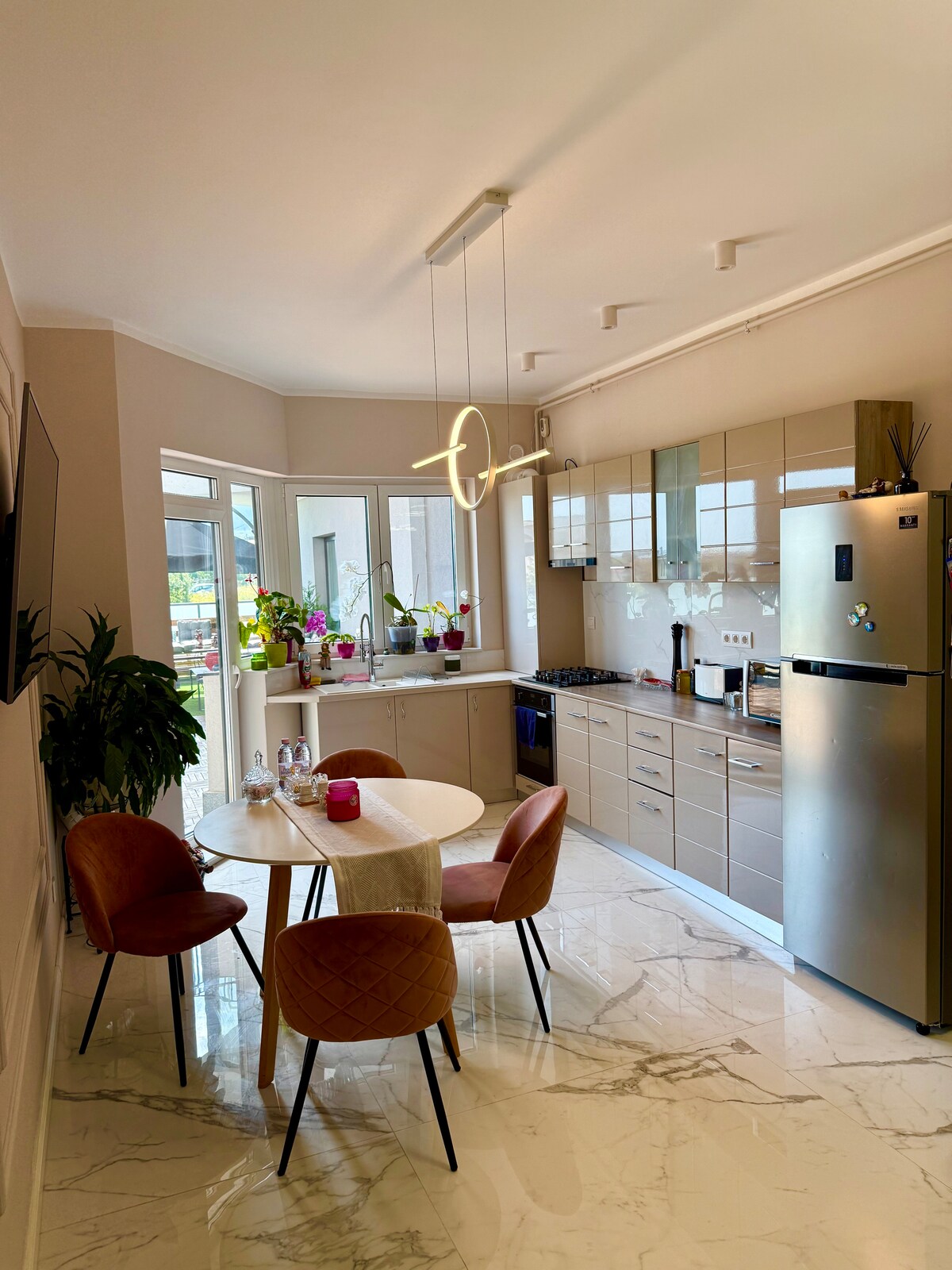 Apartament modern, elegant și primitor, ideal pentru sejururi scurte sau business. Dispune de două aere condiționate, balcon, parcare privată și un spațiu dedicat pentru lucru. Mobilat cu designer, oferă confort premium: pat king-size, bucătărie complet utilată, veselă, dotări moderne și un ambient rafinat, locul perfect pentru relaxare și productivitate.