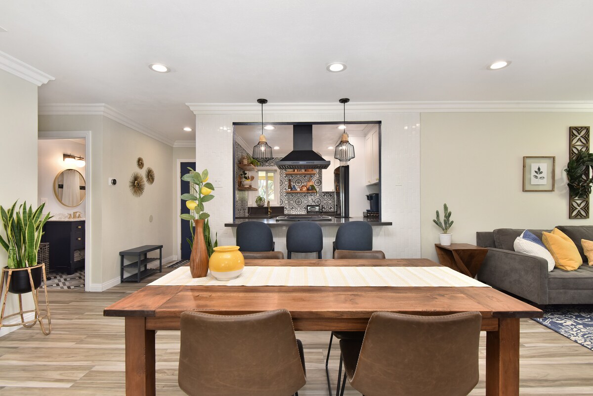 You'll have a perfect stay in this stylish & unique home only 6 miles from Disneyland! This newly updated home features a number of fun & photo-worthy spaces, including a colorful living room, a detached game room with party lights, and a ton of private outdoor space. Boasting 5 bedrooms, there is plenty of space for your entire family or group of friends. You'll be central to many of Orange County's best attractions while enjoying the serenity & comfort of a residential neighborhood.