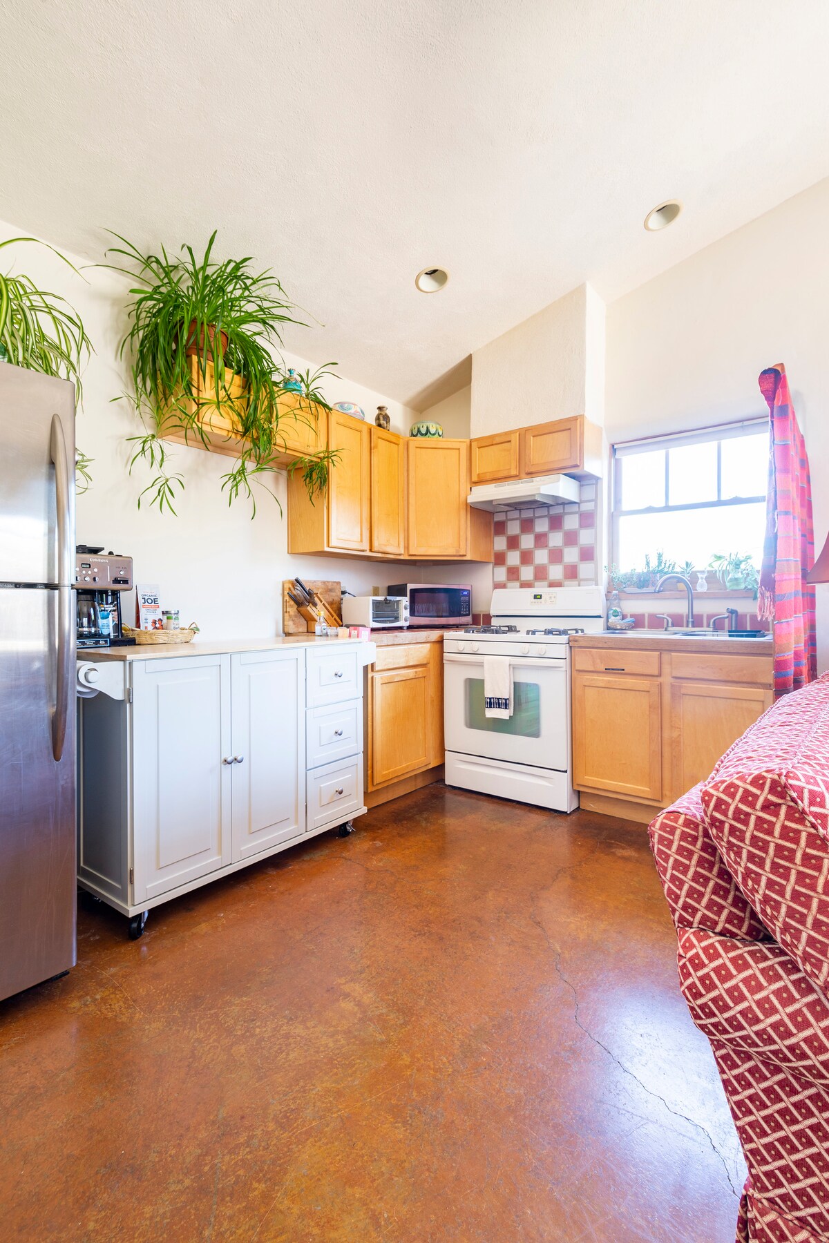 Quiet suite on the southside of Santa Fe designed for relaxation. Located in Southside near 599 & 20 minutes away from the Plaza. Main room is studio style with small living area, Queen sized bed and eating/work area. Kitchen area with everything a coffee or tea lover wants—microwave, water kettle, drip coffee maker, air fryer, and small fridge with a freezer. Walk in shower & natural light in bathroom. The suite is part of our house with a shared wall, but has its own entrance & patio.