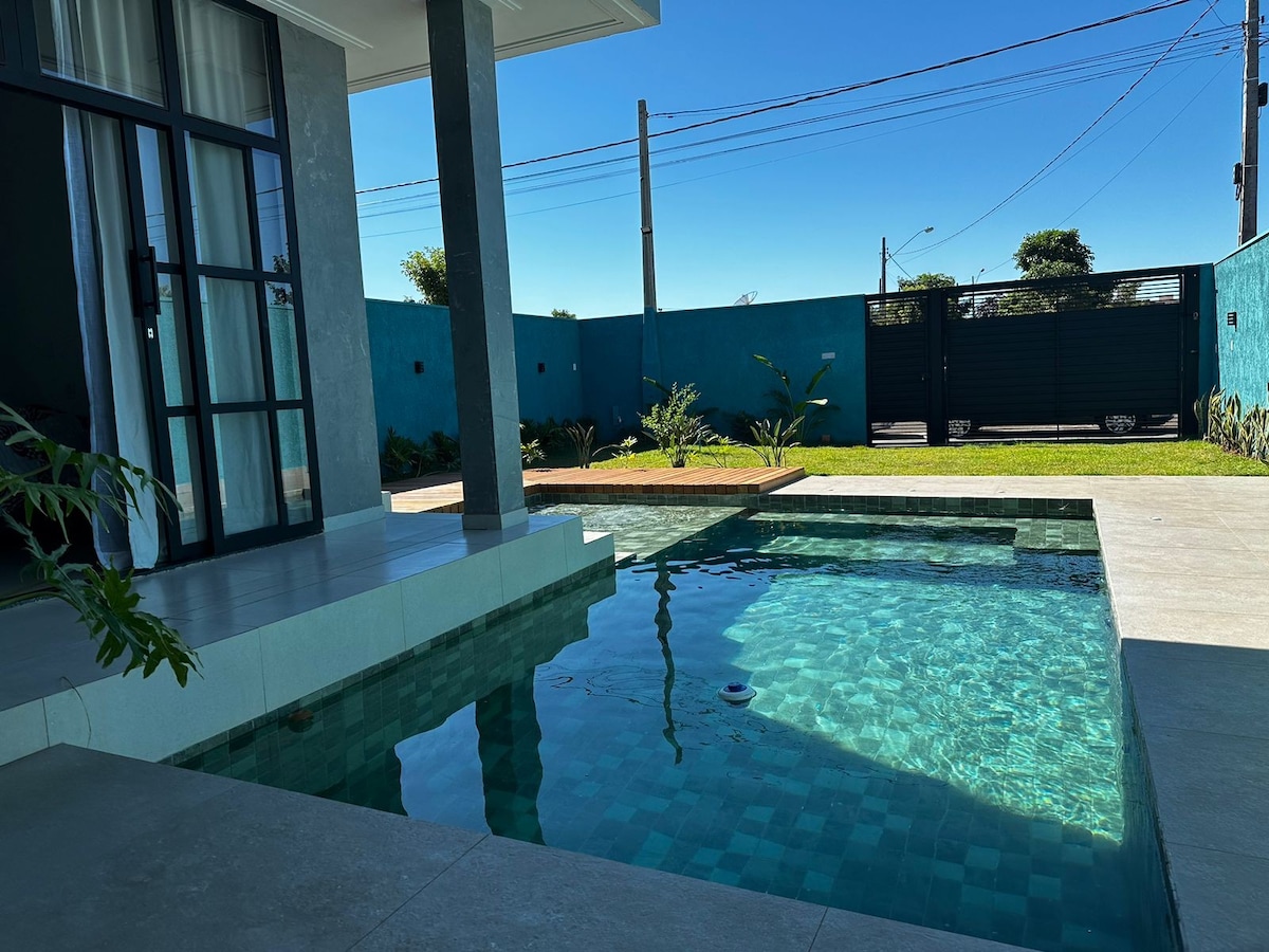 Tranquility and comfort, this house is ideal for your stay! With a large outdoor area, barbecue and outdoor shower to cool off, the space is perfect for moments of rest or family gatherings. The location is practical and strategic: just 5 minutes from downtown, where you can find shops, restaurants and services. At the same time, the accommodation offers the calm and privacy needed to relax.