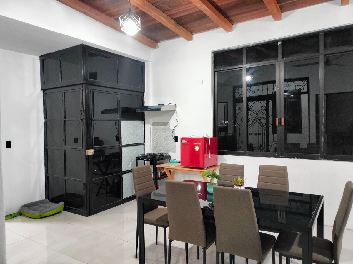 Enjoy our cozy house, its large patio and its excellent location in downtown Juchitan. In a quiet and family-friendly environment. Ideal for couples and people who enjoy nature and Mexican architecture. It has a private bathroom in the room, a living room with a TV and desk, a small kitchen with a refrigerator and stove, and a beautiful traditional corridor overlooking the patio. You can park your vehicle inside the property. Share a patio with our family home.