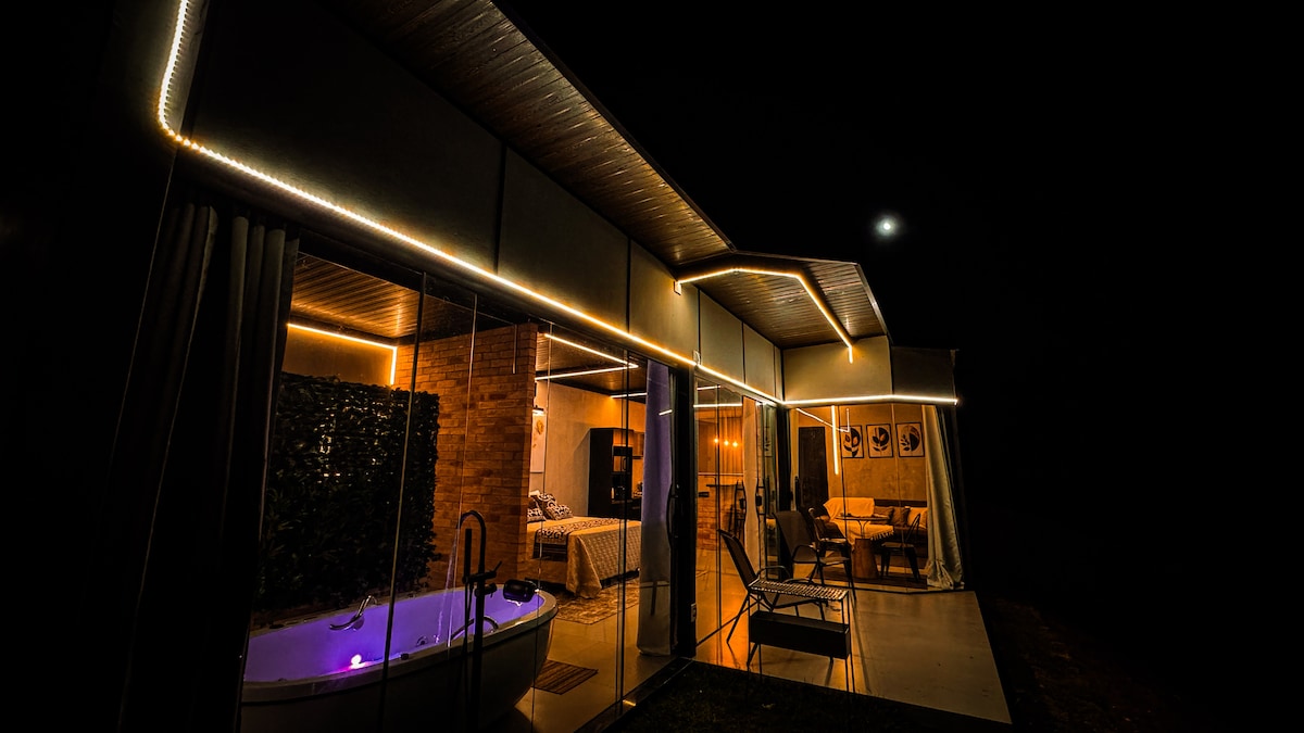Cabana moderna com vista panorâmica para as montanhas, contendo varanda, banheira dupla de hidromassagem com aquecedor, lareira interna e fogueira de chão, roupa de cama e banho, cozinha completa com utensílios, Frigobar, Cafeteira, Cooktop de 2 bocas, Airfryer, TV 32 ", Wi-Fi , cama box casal, 1 banheiro interno, estacionamento próprio Relaxe neste espaço calmo e cheio de estilo. Obs: Para uma diária não oferecemos roupa de banho