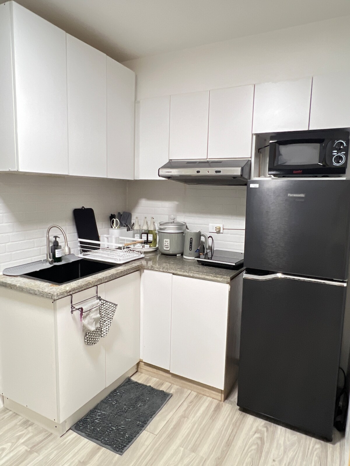 📍 Stylish 34sqm studio designed for comfort and convenience: Queen-sized bed Double-size airbed 65” Google TV, PS4 Pro, and board games Fully equipped kitchen and dining area Modern lighting and built-in outlets 🏖 Amenities: FREE pool access Fitness gym Basketball court Jogging trail Secure paid parking & 24/7 security 🧴 Guest Kit Provided: Dental kit Round soap Slippers Bath towel ⚠️Note: Tissue and dishwashing liquid are not included. 🔑 Hassle free self check-in and check-out.