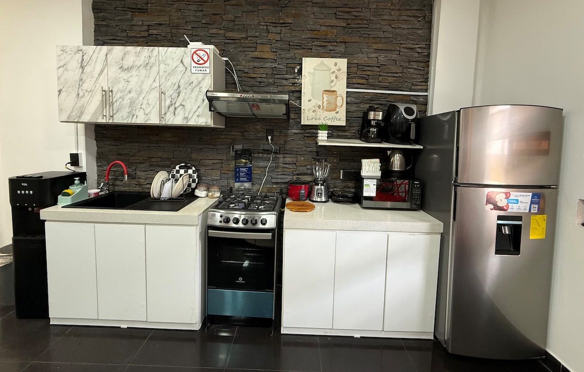 Have fun with the whole family in this accommodation with elegant and modern style with home automation throughout your house, central place 5 minutes walk you will find KFC, Gran Aki, Tuti, Pharmacies, Supermarkets, etc. 🛏️ 1 bedroom with a 2.5-seat bed 🚿 Private bathroom. 🍳 Kitchen equipped with the essentials to prepare your food. 📶 High-speed WiFi. ❄️ Air conditioning. 📺TV with Netflix access. 🧊Refrigerator. 🚗 Parking And many more things