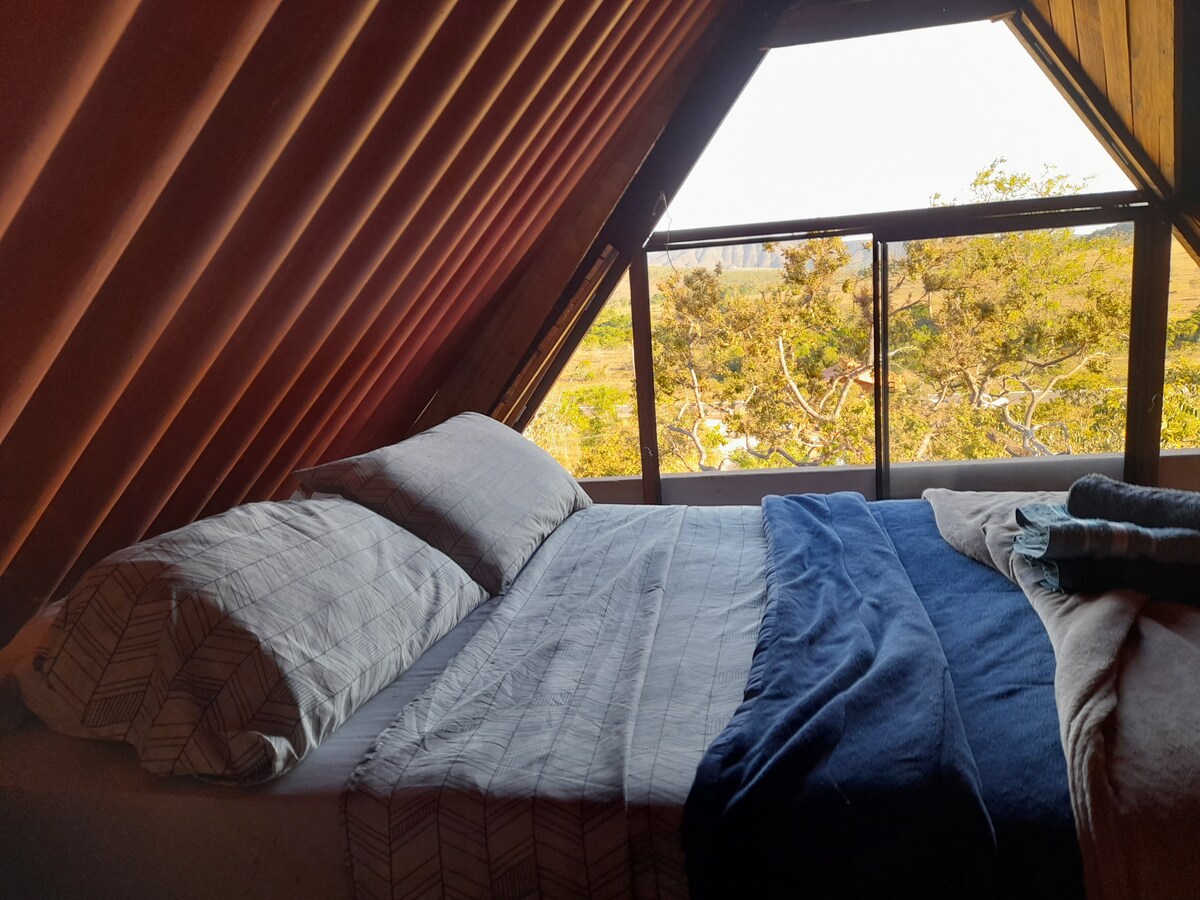 Black Rock Mountain is the first A-frame cabin, designed with maximum comfort for guests, in the municipality of São João D'Aliança, Chapada dos Veadeiros. We have emblematic waterfalls in the municipality and close to the hut, such as: * Waterfall of Label (the highest in Goiás); * Veadeiros Complex; * Bonito Waterfall; * Monkey and Jumpsuit; * Dragon Waterfall. The cabin has a comfortable room on the first floor, with air conditioning and high quality bedding.