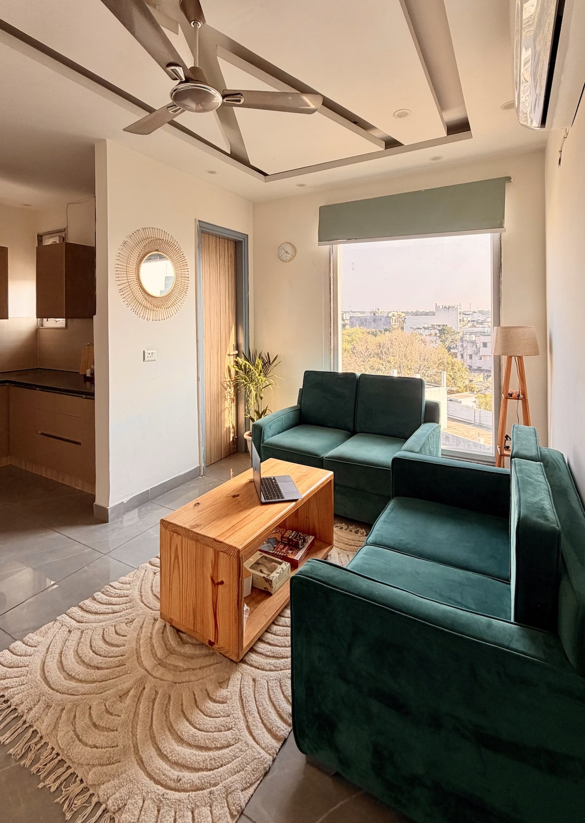 Our luxurious and serene 1BHK is situated in the heart of DLF Phase III. With a private balcony and a beautiful living room, it is the perfect spot for business travelers, corporates, couples, nuclear families, and friends seeking a comfortable, convenient, peaceful, and hassle-free stay. With a thoughtfully designed floor plan and accessible location, this home is perfect for those who are looking to relax and enjoy their quiet alone time.