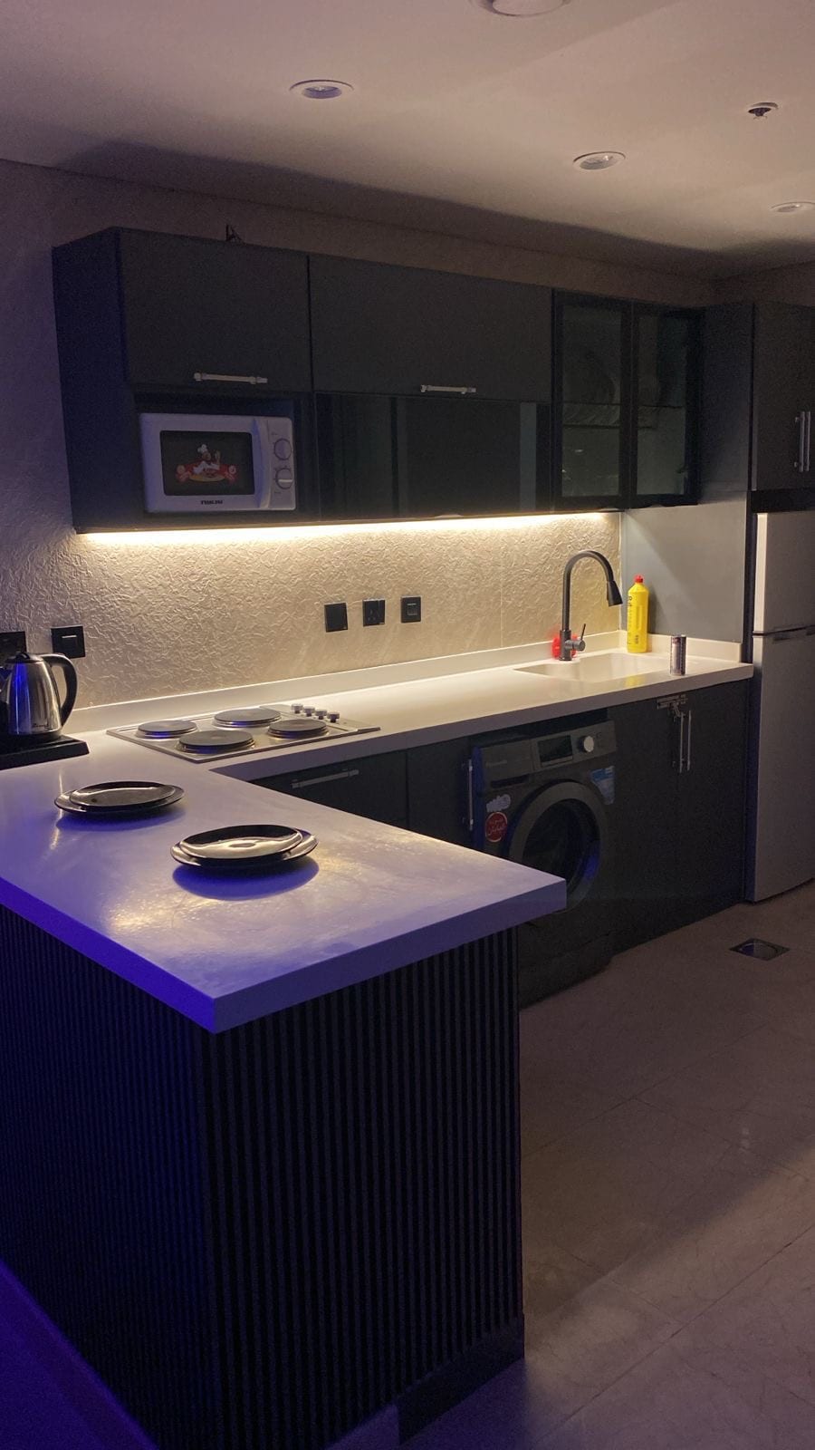 Luxury self check-in apartment with a living room open to the kitchen and dining area, master bedroom, twin room, and a triple single-bed room, plus maid room, dryer, and 3 bathrooms (shampoo, slippers, towels). • Located in Safa Compound, Al Malqa Living room has a TV with Netflix, Shahid, YouTube, and more Compound amenities: • Private parking • Pool & sauna • Gym • Game room • Kids nursery • Lounge • café • Smart Market Prime location: • 17 mins to airport • 5 mins to Boulevard