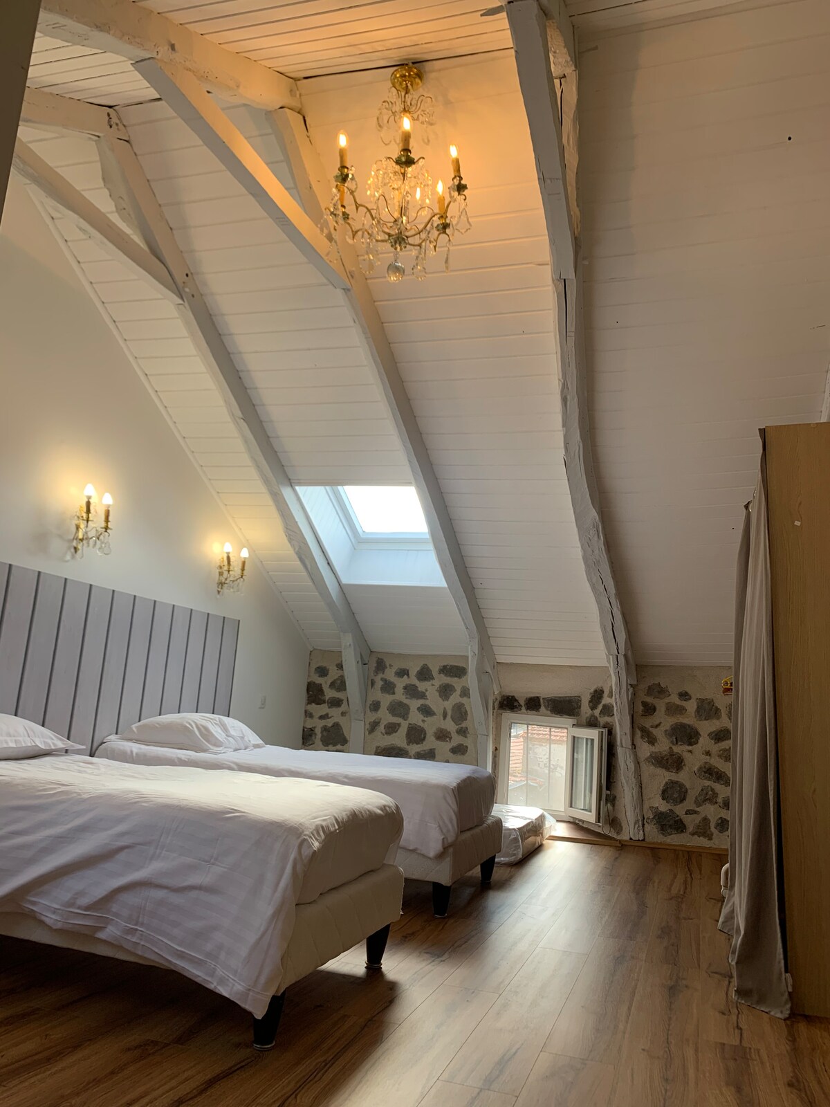 Ancienne grange, servant autrefois à entreposer les pommes des vergers de St Floret, village paisible et cité de caractère avec son château historique. Entièrement rénovée en appartements de charme, le n°7, propose une ambiance cosy et chaleureuse avec son poêle à granules et ses beaux volumes! Stationnement gratuit dans le village, bornes de recharges électriques à 200m ou garage fermé et sécurisé dans la grange! Linge de lits et de toilettes inclus! Idéal pour couple, famille, amis motards!