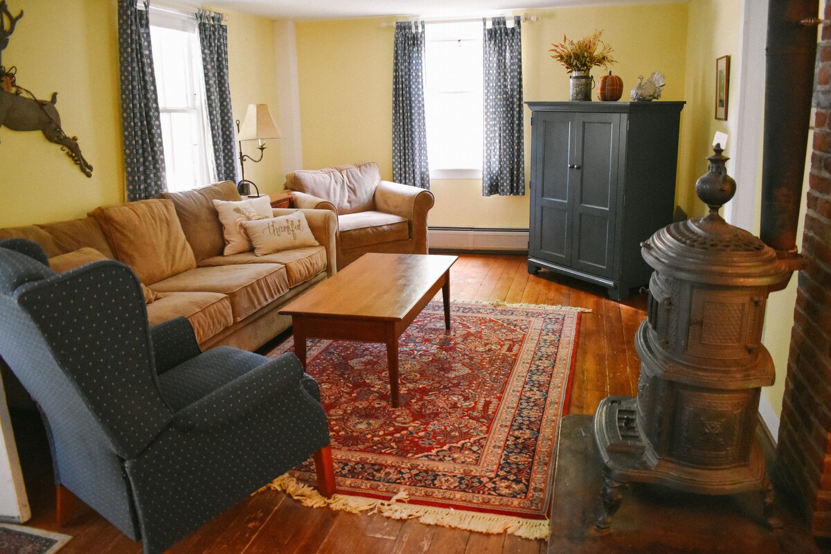 This beautiful circa 1850 farmhouse is nestled between two rivers. While it feels secluded, it is located right in Grafton Village and only a two minute walk from the Grafton Inn. There is an attached barn that has been converted to a great room with large fireplace and bar. We have a collection of bikes, tubes and snow shoes in the garage that guests are welcome to.