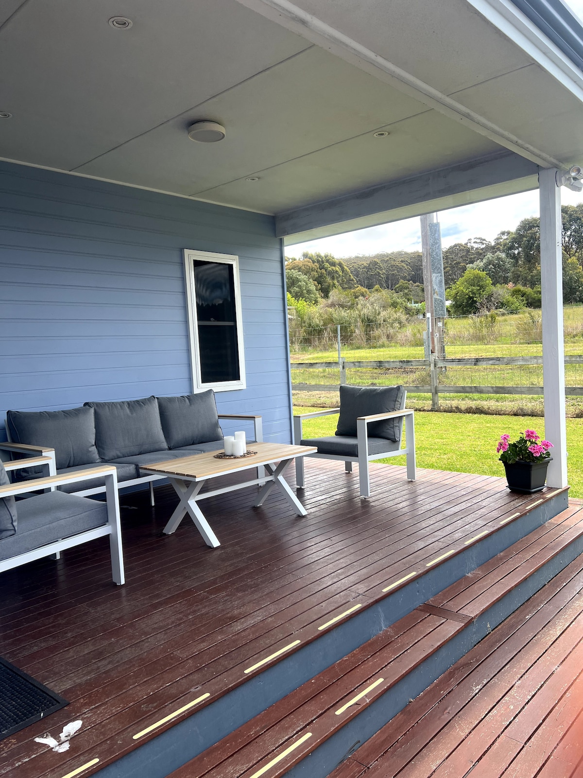 Centrally located self-contained 1 Bed Studio with private bathroom, kitchenette and laundry. Next to a Karri reserve with outdoor sitting area. Easy 5 min walk into town with private entrance and plenty of parking. Everything two people need for a relaxing Denmark base. Features reverse cycle AC, queen bed, smart tv, lounge, tea/coffee, cereals, filtered water, BBQ, games, books & gym. The Studio is adjacent to the main house but private at the front of the property, you won't be disturbed.