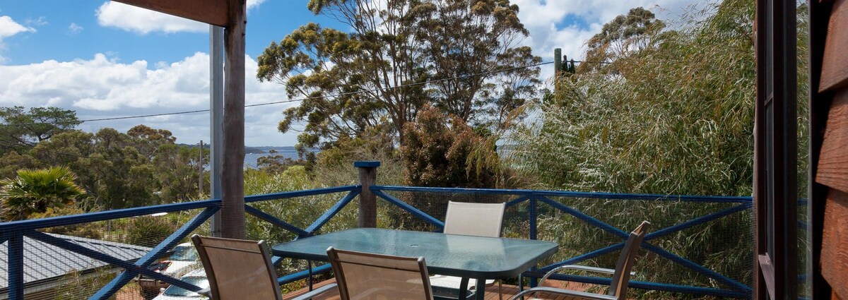 Enjoy the tranquillity of this uniquely designed octagonal chalet, set high on Weedon Hill in a natural Australian bush setting. Inlet glimpses, sounds of the ocean, sunrises, abundant birdlife and native bush vistas from every window are but a few of the wonders you will experience. With large windows throughout your experience of the outdoors is intensified in this cosy wooden cottage with woodfire for extra warmth & coziness. Only 3km from town centre, however feels like you are miles away.