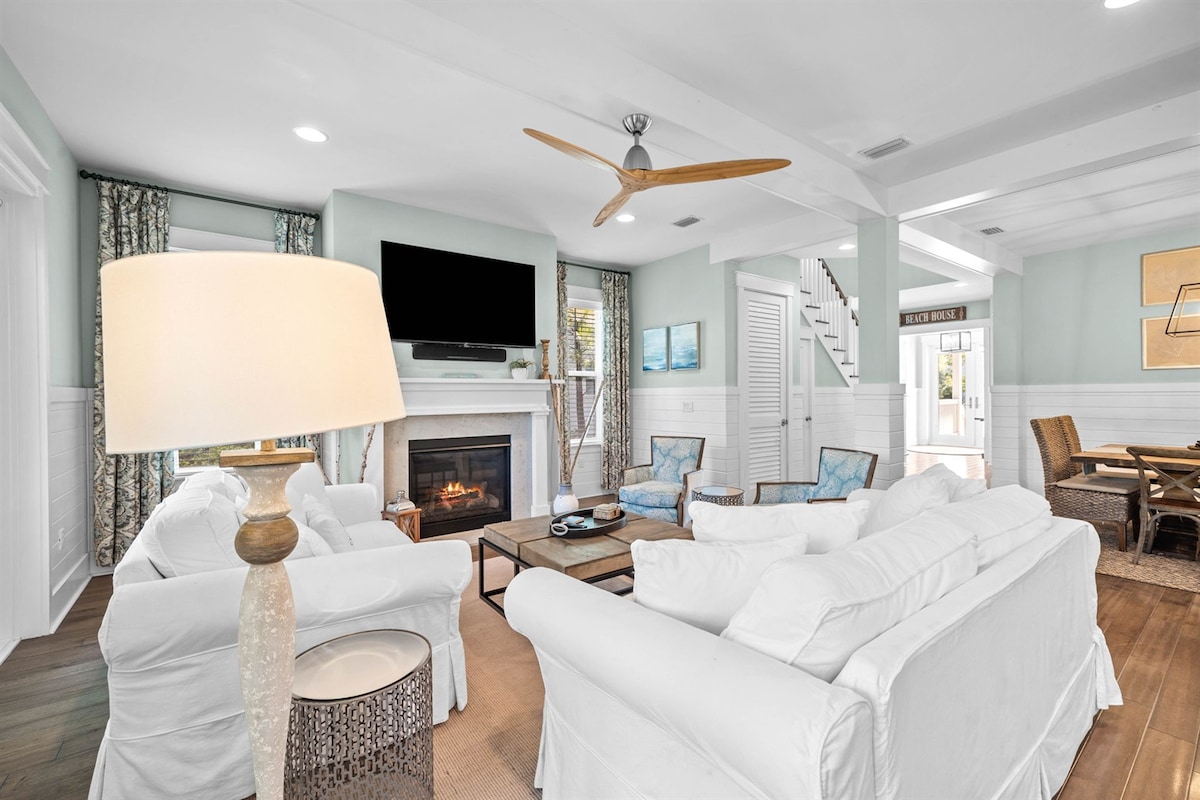 Sleeps 25! In the heart of Old Seagrove, Steps to Seagrove Market/Beach, Surfing Deer, Publix & Seaside! 5-MIN walk to beach! 6-Seater LSV/golf cart & 6 Bikes Included! STUNNING beach home loaded w/ amenities, top-of-the-line finishes & furnishings! Outdoor oasis with private heated pool with sun shelf, water fountains + lights, fire pit, TV, outdoor kitchen w/ green egg, & the cutest DETACHED KIDS PLAYHOUSE! 4th floor air-conditioned lookout tower w/ TV, sun room, balcony & Gulf views!