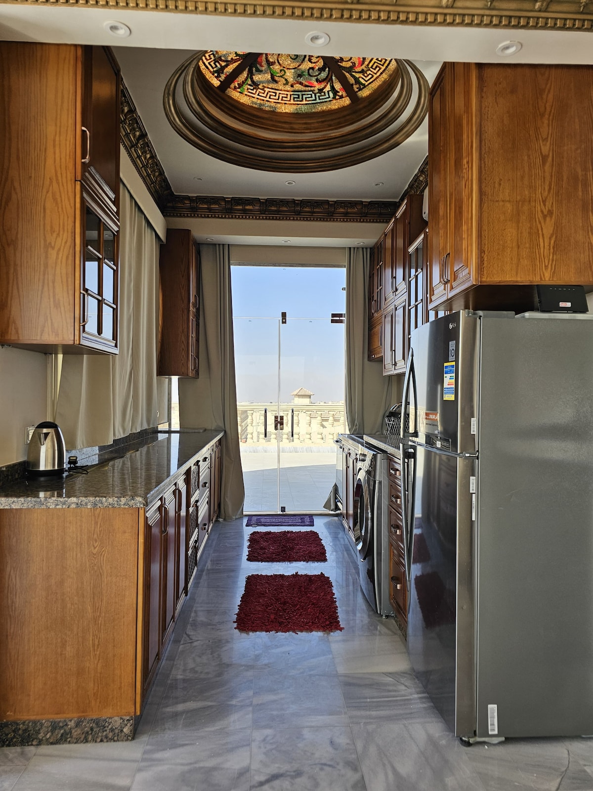 Take it easy at this unique and tranquil getaway. At the highest point of all surrounding neighborhoods this simple, yet with a luxurious view, Penthouse serves a 360° view of Cairo’s sunrise and sunset! Bubble in your outdoor heated jacuzzi while enjoying New Cairo’s refreshing air and quiet surroundings. To provide you with a smoother - hassle free experience, we are fully responsible of your baggage handling up and down the 4 flights!