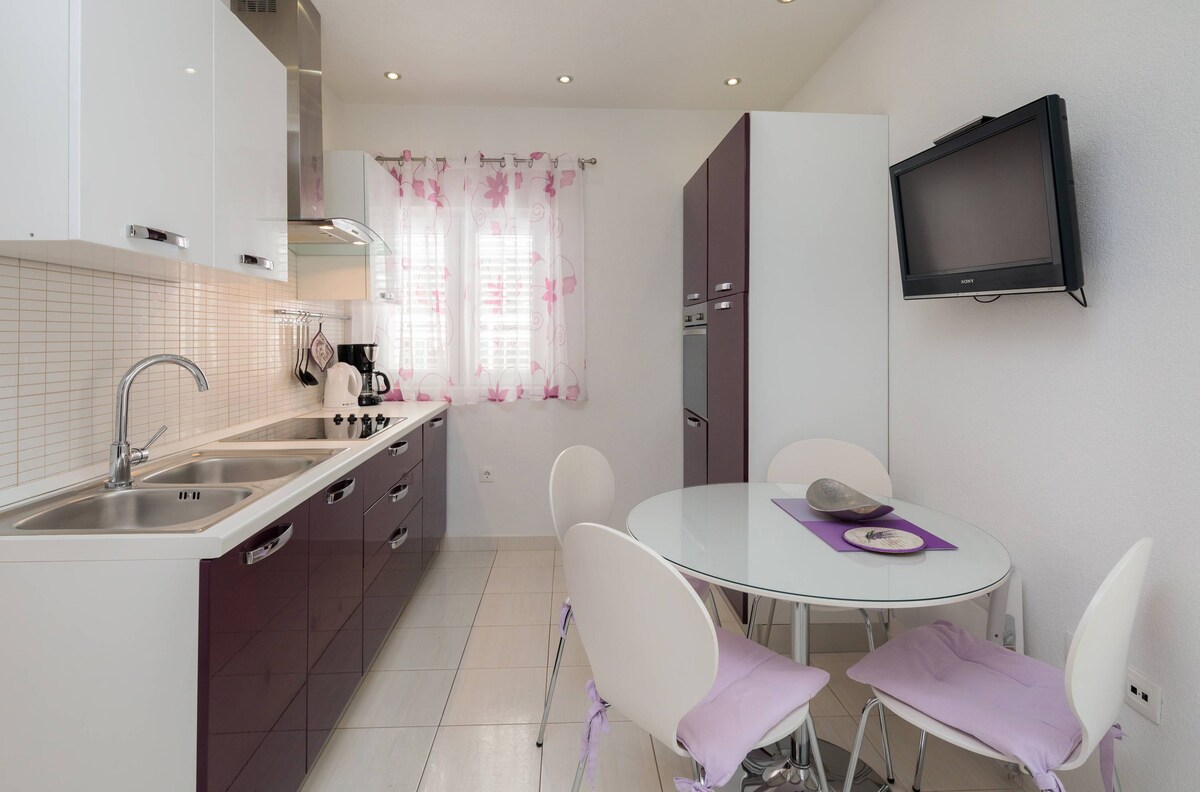 Royal is new, modern & luxury renovated apartment with jacuzzi, 50 meters away from beach. Has 50 square meters and 30 square meters terrace. Comes with 2 bedrooms, a living room, a fully eqipped kitchen with a dining area, bathroom with great shower, barbecue facilities, garage(1 car) , flat-screen TV in every room and free wi-fi. Offers a big terrace with open sea view on surrounding islands. Diving can be enjoyed nearbly. Trogir is 5 km away and Split airport 8 km from the acommodation.