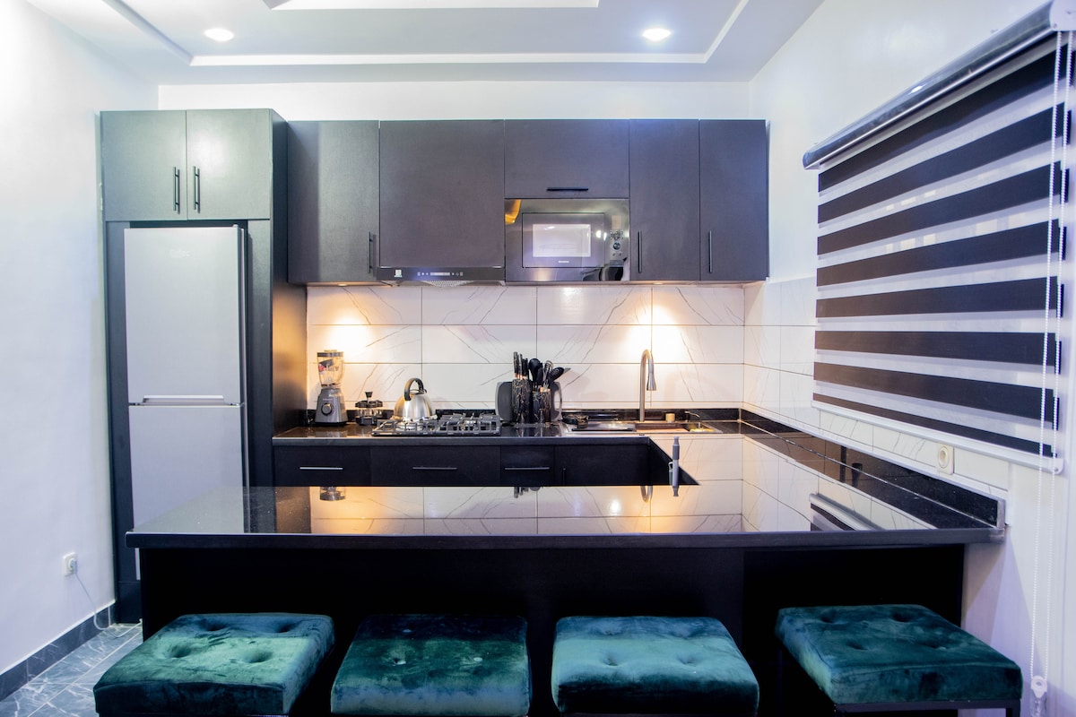 The result of an ardent passion and proven know-how, Black Extaz is unpretentiously one of the most complete T2s in Cotonou: 80 m2 in the middle of the city, in a modern building, tastefully furnished and equipped to excess: Fiber optics, water heater, washing machine, hairdryer, coffee machine, mini safe, Netflix, desk, Roof top... Everything has been designed to give you a unique experience. Black Extaz also has attentive hosts and lots of good suggestions for you!