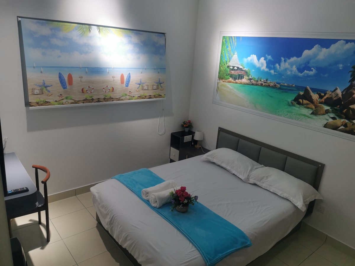 Explore our cozy studio, which can accommodate 2 to 3 people with a queen bed and a sofa bed. Only a 15-minute drive from KLIA T1/T2, the place is surrounded by many restaurants, fast food branches, groceries, and laundry shops, all within walking distance. Savor all the amenities, including the kids’ playground, BBQ area, gym, and swimming pool, with 24/7 security. * Unavailable drop your luggage before check in hours.Due to building designed, need to walk 10 steps staircase to get elevator.