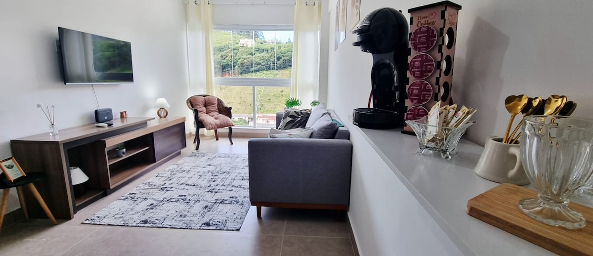 Sophisticated, cozy and romantic, located in the center. Finely decorated and equipped. Distinguished apartment, with a comfortable en-suite with queen bed and TV. Second bedroom with two single beds. Spacious social bathroom with shower. Living room with 55" Smart TV and fireplace. Wi-Fi. Balcony overlooking the city and mountains. Cozy and warm dining room. Kitchen with dishwasher. Complete pantry with washing machine. Ideal for a romantic or family stay.