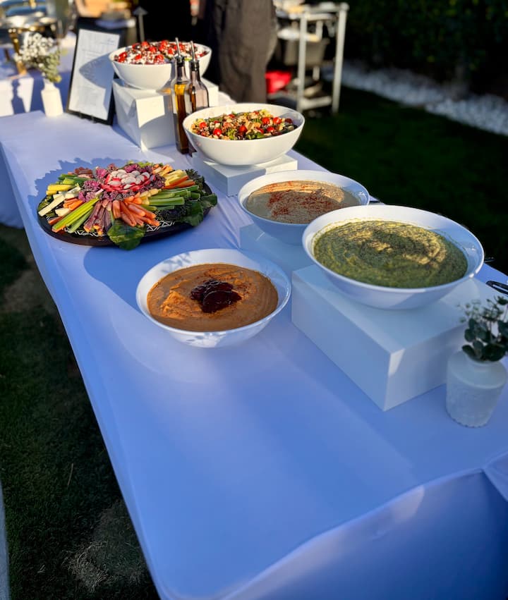 The Mediterranean signature menu showcases a refined, multi-course menu featuring premium ingredients, bold flavors, and beautiful presentation. Guests will enjoy a curated selection of mezze to start, followed by expertly prepared proteins and vibrant seasonal sides and dips.Our team provides a complete dining setup, utilizing elegant chafing dishes thoughtfully selected serving pieces.
