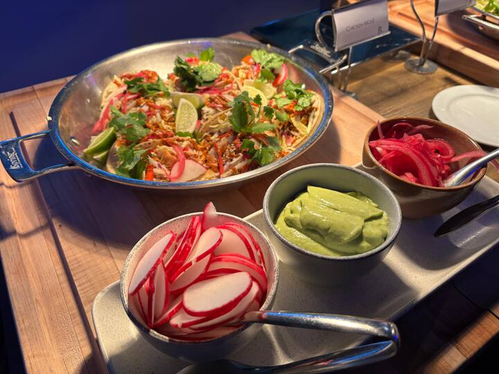 Enjoy a laid-back, family-style buffet featuring a spread of dips and chips, your choice of proteins—steak, chicken, or seafood—paired with comforting sides like mashed potatoes and roasted Brussels sprouts. Savor fresh, farm-to-table vegetables selected by the chef, such as garlic-charred broccoli, and finish on a sweet note with desserts like Texas pecan pie and panna cotta.”