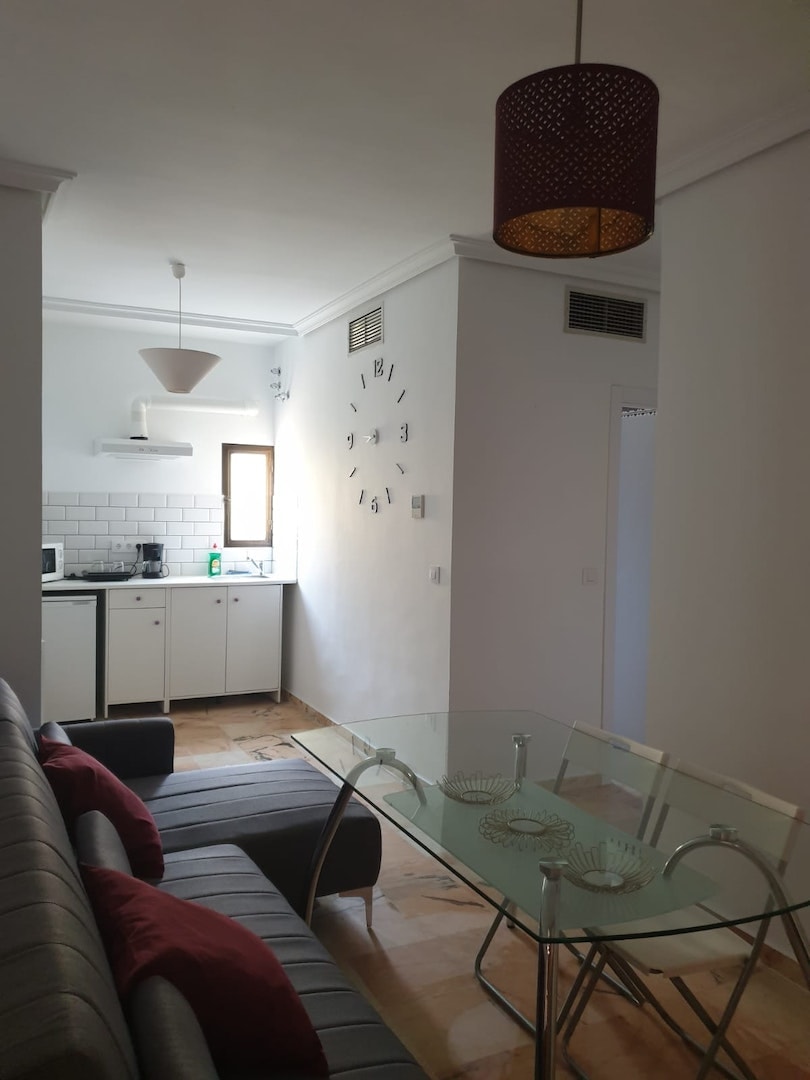 The apartment has: an open plan equipped kitchen, living room with sofa bed and a bedroom with double bed. The bathroom has a shower, hairdryer and towels. The capacity of the apartament is 4 people. The building, completely renovated respecting its original Andalusian style, with elevator and communal terrace with wonderful views of the city. Tourist license: A/ SE / 00327
