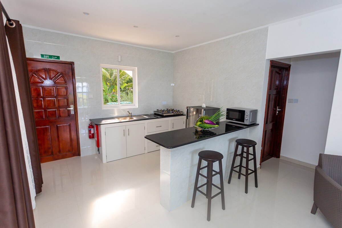 Lovely spacious one bedroom apartment, in an ideal beachfront location on Mahe Island's scenic north-east coast. Our one bedroom apartment boasts a master bedroom with ensuite bathroom with shower, open plan fully fitted kitchen, living room and eye-catching terrace that opens out onto a large tropical garden that is part of the complex. Your apartment overlooks the ocean. Key features include direct beach access, private terrace, complimentary wifi, in-room safe, shared pool to name a few.