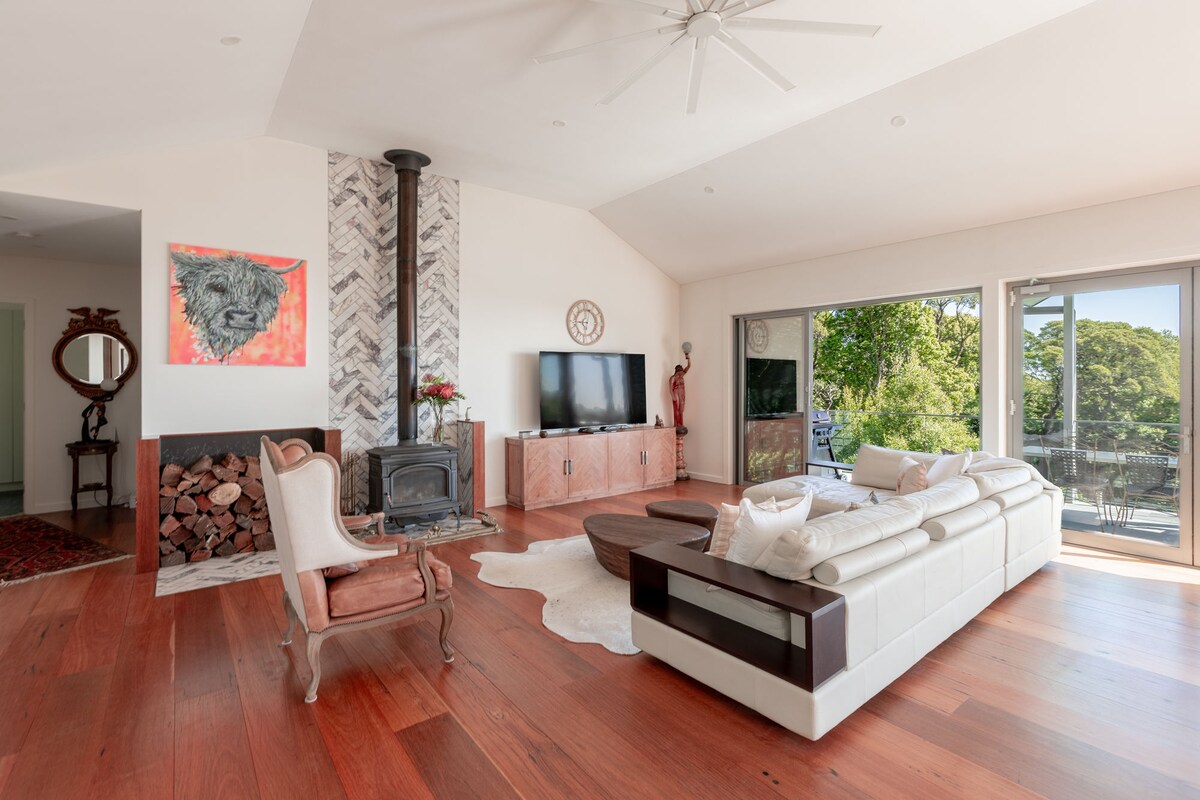 15% off discount for May! Perched high on Knights Hill above Jamberoo, Miste Tor is a modern farmhouse retreat with sweeping views from Sydney Airport to Gerringong. Set on historic dairy land with rainforest, koi pond and friendly cows and horses, it offers 4 double bedrooms, 4 bathrooms and generous open-plan living. Wake to birdsong, push open the doors, enjoy a peaceful sanctuary for long lunches, slow mornings and starry nights by the fire that you’ll never want to leave.