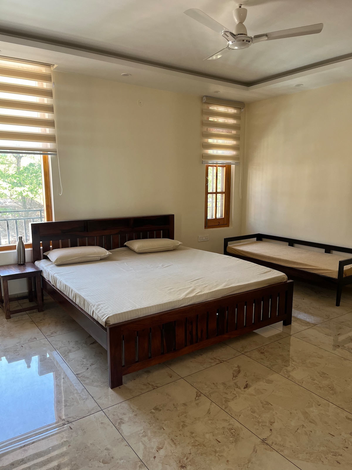 Welcome to Glasswood Celeste - a glass-and-wood studio crafted without brick or mortar.Floor-to-ceiling glass panels, warm wooden ceilings, and blind-out curtains create a space that feels open by day and cocooned by night.Located in the heart of the city wit Spiral Staircase access,this design-led retreat features a king canopy bed, ambient lighting,55” TV,AC (hot & cold),a luxe bathtub and a private terrace with Dhauladhar views.Designed for those who appreciate aesthetics,light and stillness.