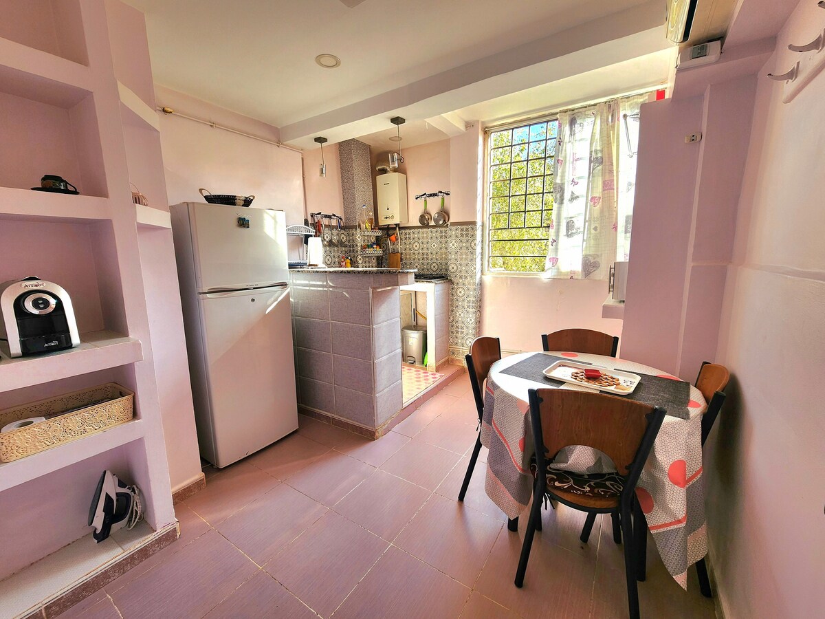 Small bright, comfortable and warm apartment, located in the city center of Tlemcen on the 2nd floor and fully equipped with all amenities. It overlooks Boulevard Pasteur. Wifi, TV, fully equipped kitchen, linen provided and free parking. You will appreciate the proximity to shops and restaurants, as well as the safety of the neighborhood. Comfortable beds and hot water will complete your experience. Book now for an unforgettable stay in Tlemcen.