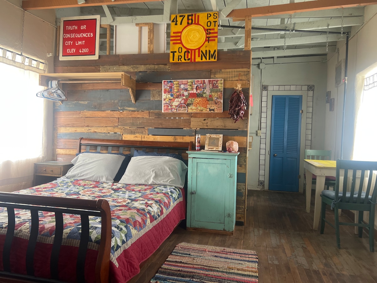 A fun and quirky place to stay. Two bedroom one bath refurbished 1970's trailer close to Elephant Butte Lake and Sierra Del Rio golf course. Just minutes from historic Truth or Consequences NM where you can enjoy relaxing hot mineral baths, art shops and restaurants. Fully fenced and dog friendly with a covered patio, plenty of parking, cold AC and complimentary coffee, tea and bottled water. Enjoy the sunshine, endless blue sky and beautiful starry nights.