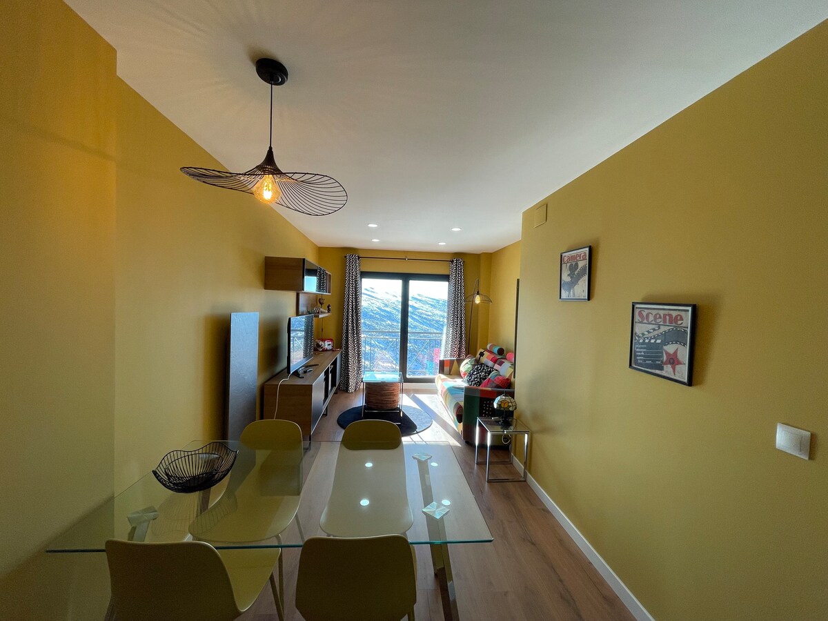 Spectacular apartment with views of the slopes in the lower area of Sierra Nevada, with a parking space, Wi-Fi, Netflix for 6 people. Monte Gorbea building, behind Hotel Meliá, 300 meters from the chairlift The apartment is composed of: living room/kitchen with 1 double sofa, double bed, entrance with 2x80cm bunk bed of 180 cm and bathroom. Garage included. Check-in/check-out is 500 meters walk from the apartment and 4.5 km by car because Sierra Nevada only has one direction