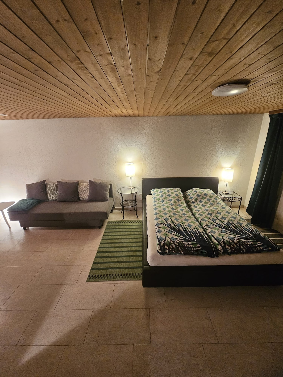 We rent a very nice, newly furnished and cozy 30 m² apartment with separate bedroom. In the open living room with kitchen and dining area, there is a large sofa bed. The apartment has a separate apartment entrance and is on the first floor (no steps). The free parking is right next to the apartment. The apartment is located in the middle of the village and is easy to find. Just three minutes to the bus stop, 40 minutes to Zurich. We, the host family, live on the upper floor.